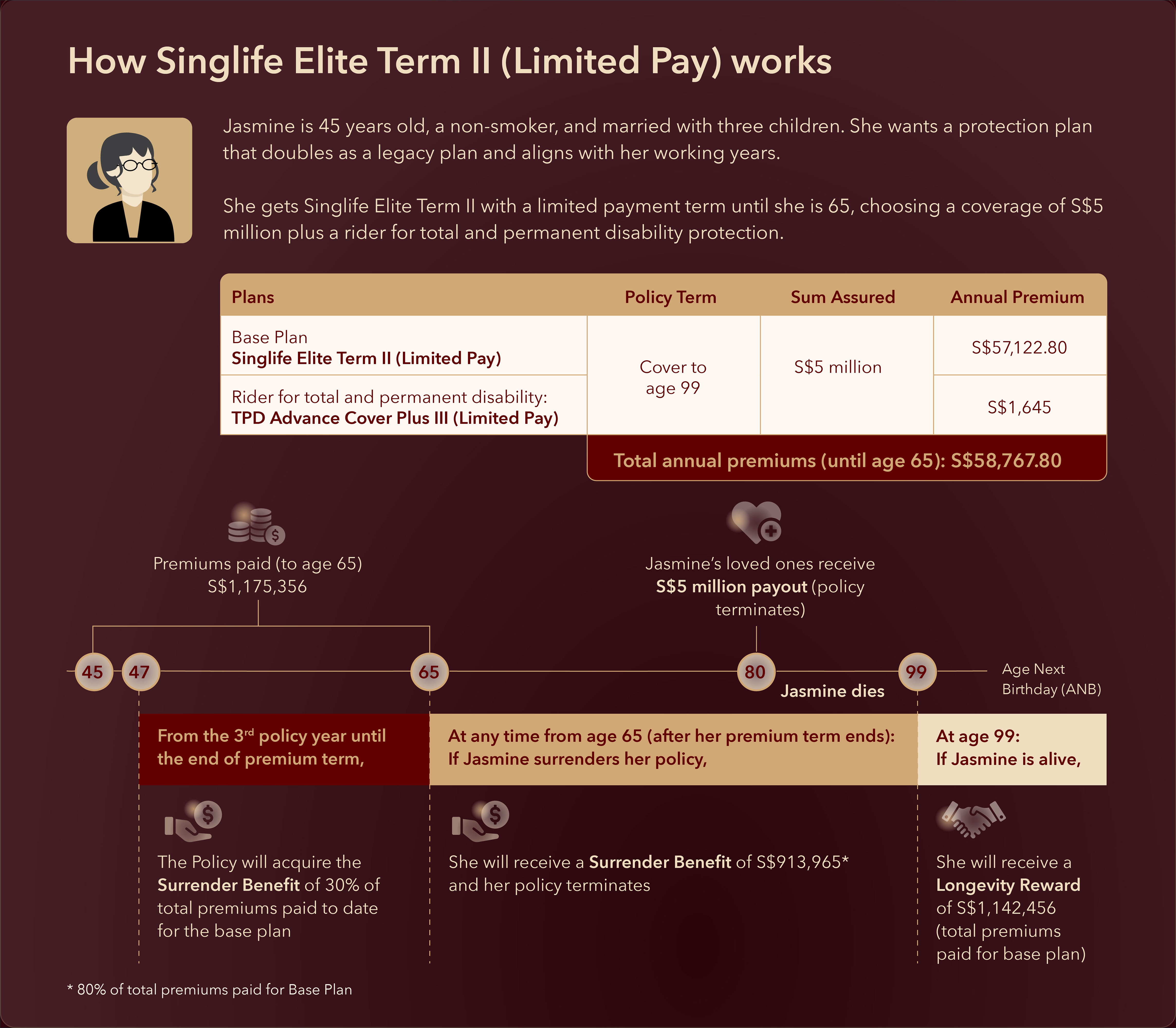 2. Longevity Reward is only applicable to Singlife Elite Term II (Limited Pay) policies. If the policy is held until the end of coverage term at age 99, we will pay 100% of Total Premiums Paid for the base plan, subject to the policy terms and conditions.