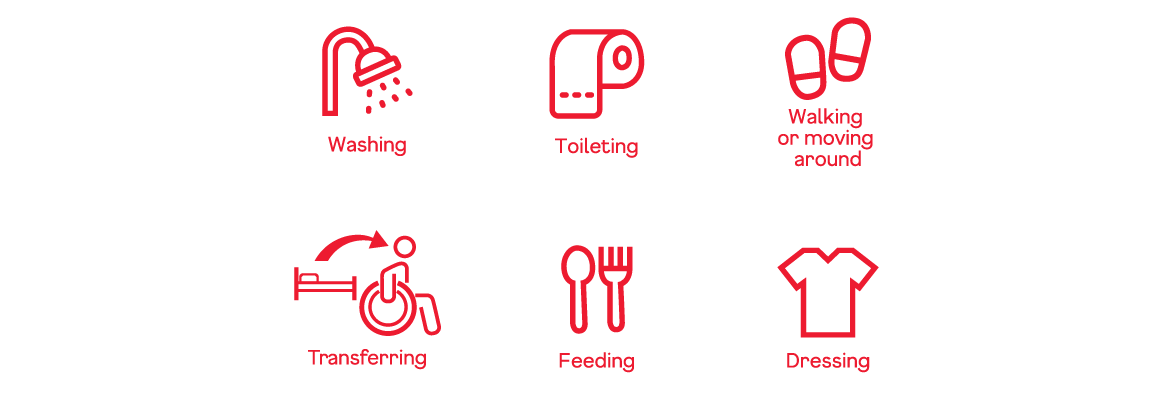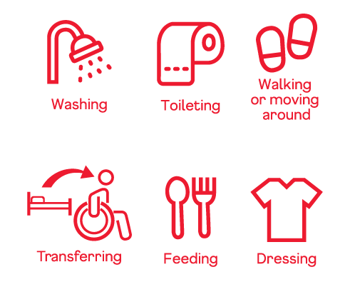 The ADLs are washing, toileting, feeding, dressing, transferring around and walking or moving around.